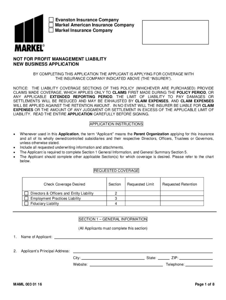 Evanston Insurance Company Market American Insurance Company Market Insurance Company FOR PROFIT MANAGEMENT LIABILITY NEW BUSINESS APPLICATION BY COMPLETING THIS APPLICATION THE APPLICANT IS APPLYING