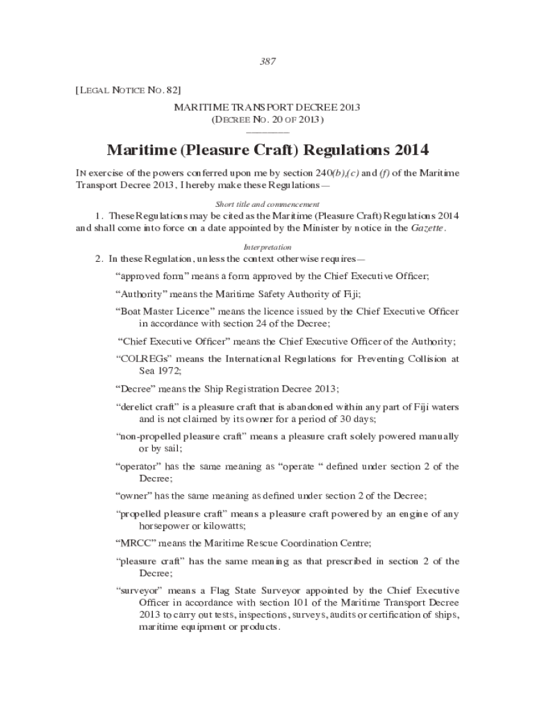 387 [LEGAL NOTICE NO. 82] MARITIME TRANSPORT DECREE 2013 (DECREE NO. 20 OF 2013) ___Maritime (Pleasure Craft) Regulations 2014 IN exercise of the powers conferred upon me by section 240(b), (c) and