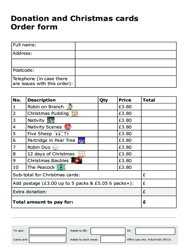 Donation and Christmas cards Order form Full name: Address:Postcode: Telephone (in case there are issues with this order):No. DescriptionQtyPrice1Robin on Branch3.802Christmas Pudding3.803Nativity3.804Nativity