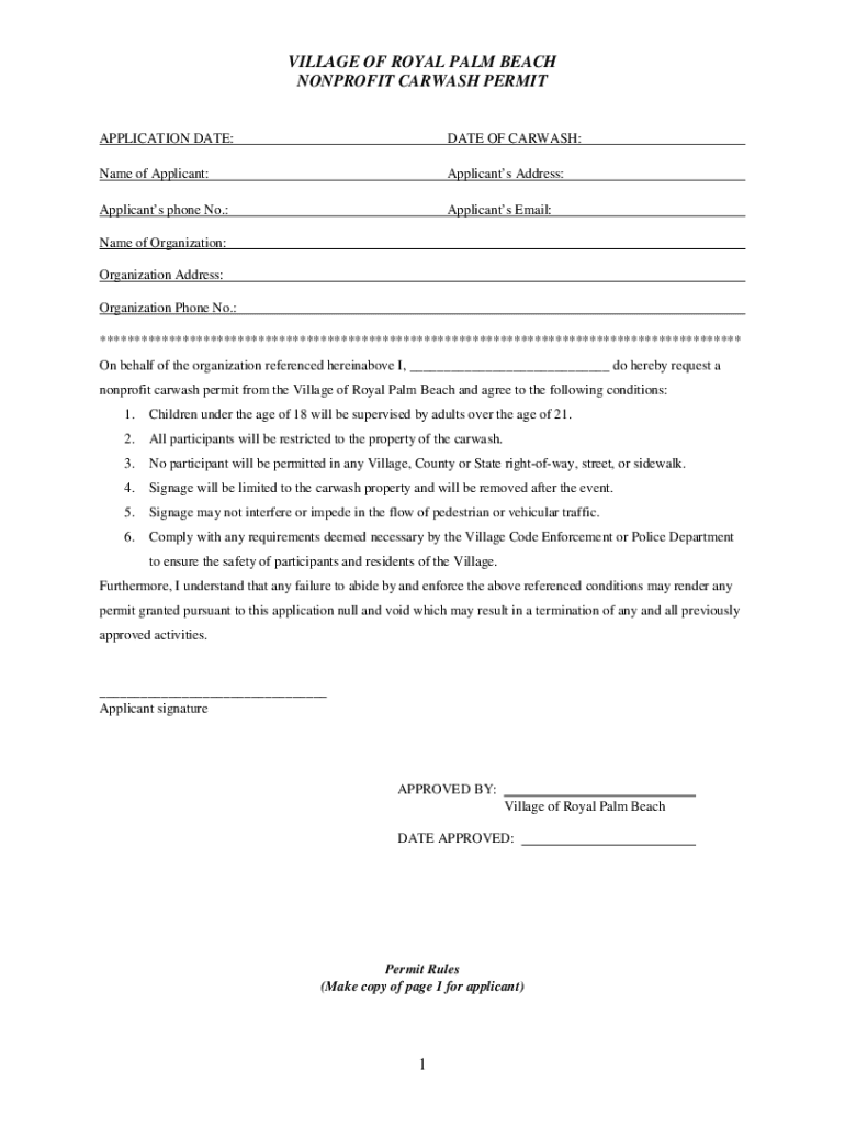 To fill out a non-profit car wash permit, organizations must provide information about the event, location, date, and purpose of the fundraiser.