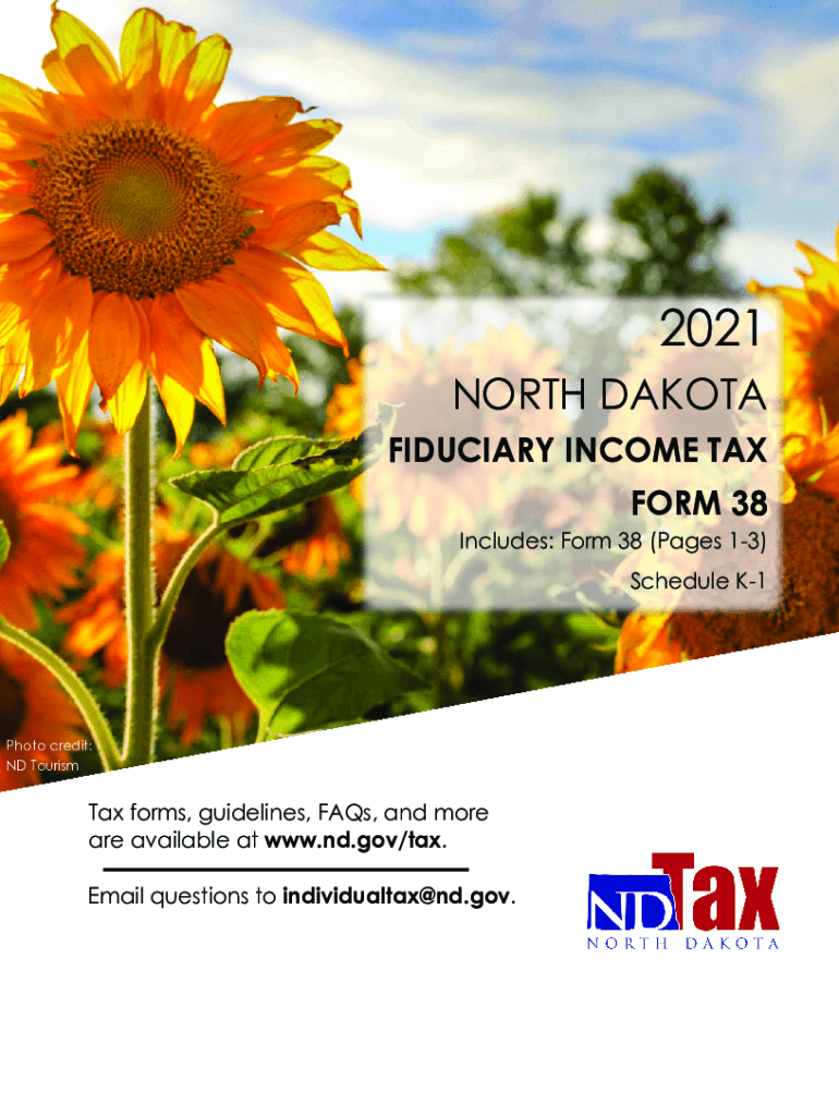 2021 NORTH DAKOTA FIDUCIARY INCOME TAX FORM 38Includes: Form 38 (Pages 13)Schedule K1Photo credit: ND Tourism forms, guidelines, FAQs, and more are available at www.nd.gov/tax. Email questions to