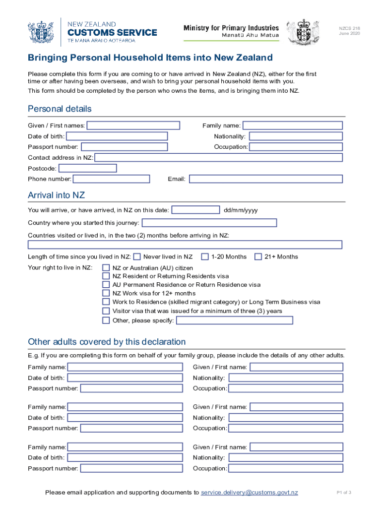 NCS 218 June 2020Bringing Personal Household Items into New Zealand Please complete this form if you are coming to or have arrived in New Zealand (NZ), either for the first time or after having been