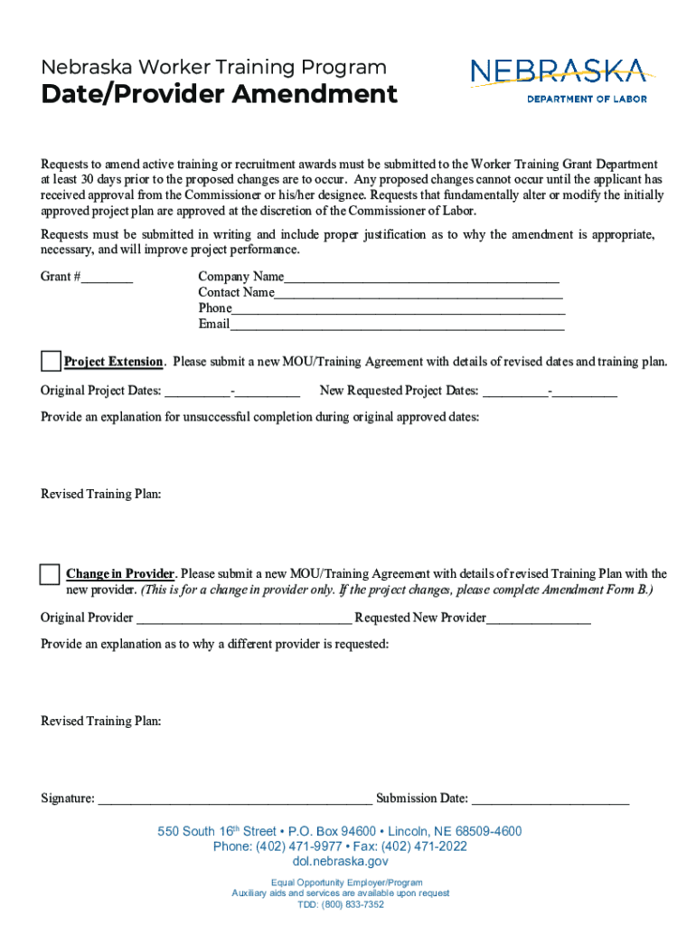 Nebraska Worker Training Programmable/Provider Amendment Requests to amend active training or recruitment awards must be submitted to the Worker Training Grant Department at least 30 days prior to