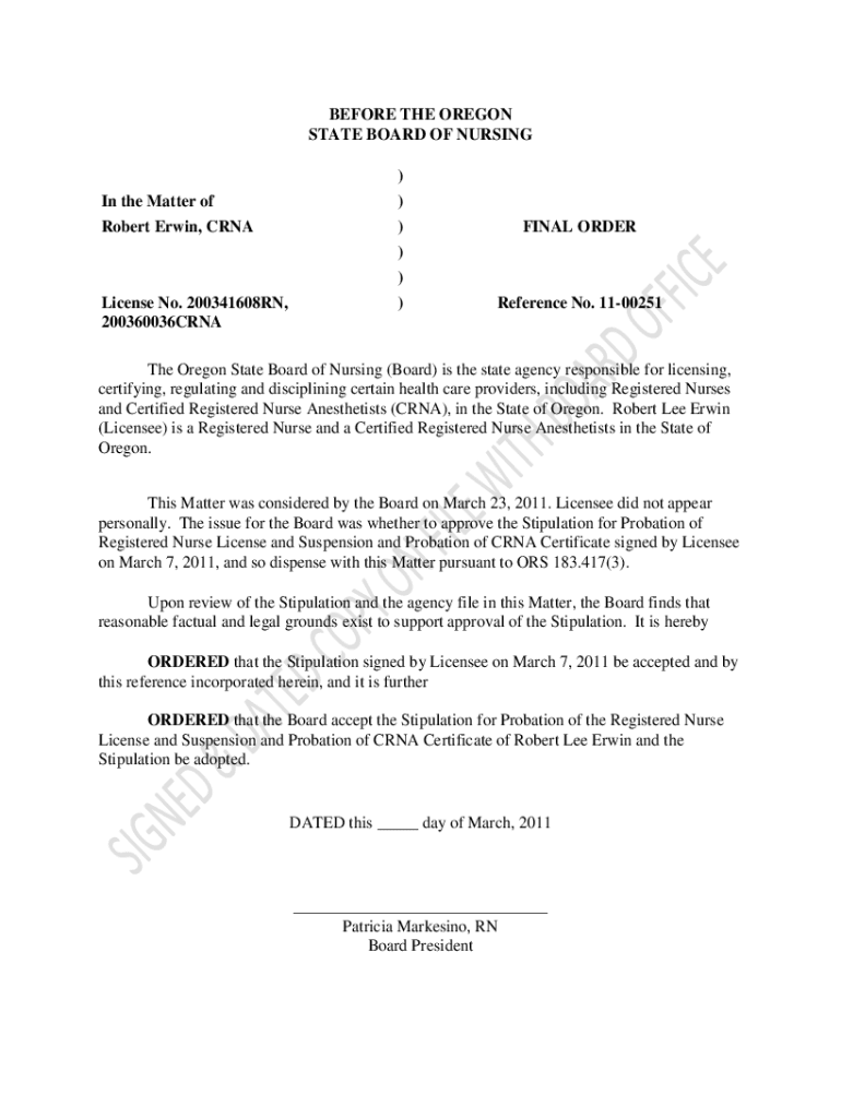 BEFORE THE OREGON STATE BOARD OF NURSING In the Matter of Robert Erwin, CRNALicense No. 200341608RN, 200360036CRNA))))))FINAL ORDERReference No. 1100251The Oregon State Board of Nursing (Board) is