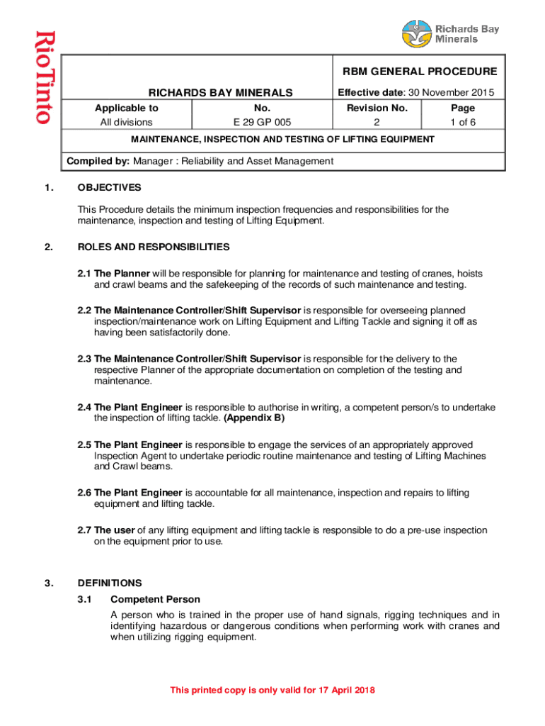 RBM GENERAL PROCEDURE RICHARDS BAY MINERALSEffective date: 30 November 2015Applicable too. Revision No. Pageant divisions 29 GP 00521 of 6MAINTENANCE, INSPECTION AND TESTING OF LIFTING EQUIPMENTCompiled
