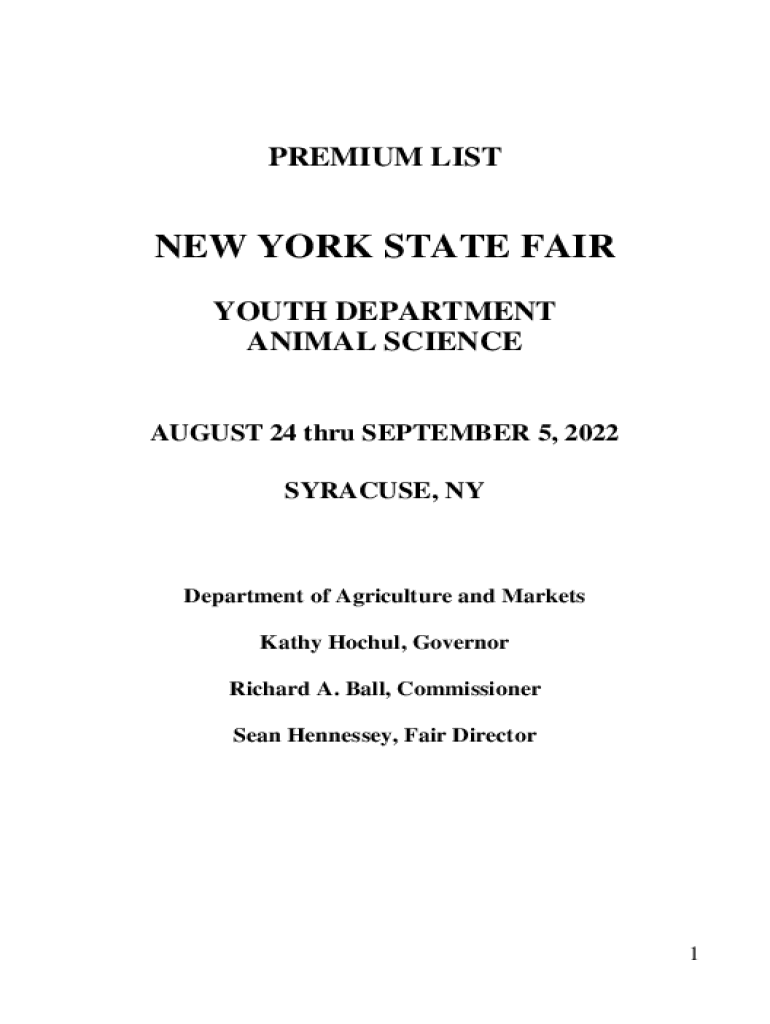 PREMIUM LISTED YORK STATE FAIR YOUTH DEPARTMENT ANIMAL SCIENCEAUGUST 24 through SEPTEMBER 5, 2022, SYRACUSE, Department of Agriculture and Markets Kathy Bochum, Governor Richard A. Ball, Commissioner