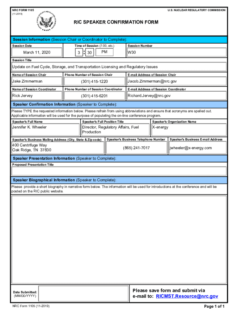 NRC FORM 1105U. S. NUCLEAR REGULATORY COMMISSION(112019)RIC SPEAKER CONFIRMATION FORM Session Information (Session Chair or Coordinator to Complete): Session Date March 11, 2020Session Summer of Session