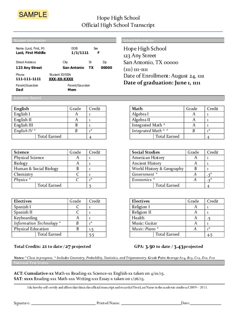 SAMPLE Hope High School Official High School TranscriptStudent InformationSchool Informational (Last, First, M)Oblast, First Middle1/1/1111SexFStreet AddressCitySt123 Any Street San AntonioTXPhoneStudent