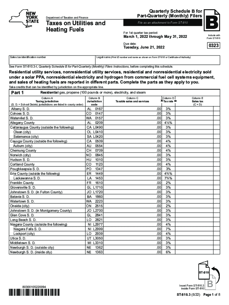 Quarterly Schedule B for PartQuarterly (Monthly) FilersDepartment of Taxation and FinanceTaxes on Utilities and Heating Fulfill as an attachment to Form ST810 For 1st quarter tax period:Include with