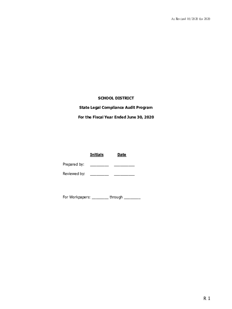 As Revised 10/2020 for 2020SCHOOL DISTRICT State Legal Compliance Audit Program For the Fiscal Year Ended June 30, 2020InitialsDatePrepared by:______Reviewed by:______For Work papers: ___ through