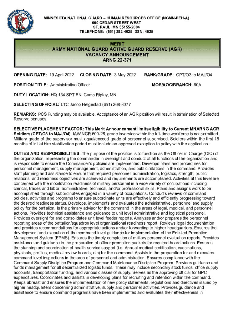 MINNESOTA NATIONAL GUARD HUMAN RESOURCES OFFICE (NGMNPEHA) 600 CEDAR STREET WEST ST. PAUL, MN 551552004 TELEPHONE: (651) 2824625 DSN: 4625MERIT ARMY NATIONAL GUARD ACTIVE GUARD RESERVE (AGR) VACANCY