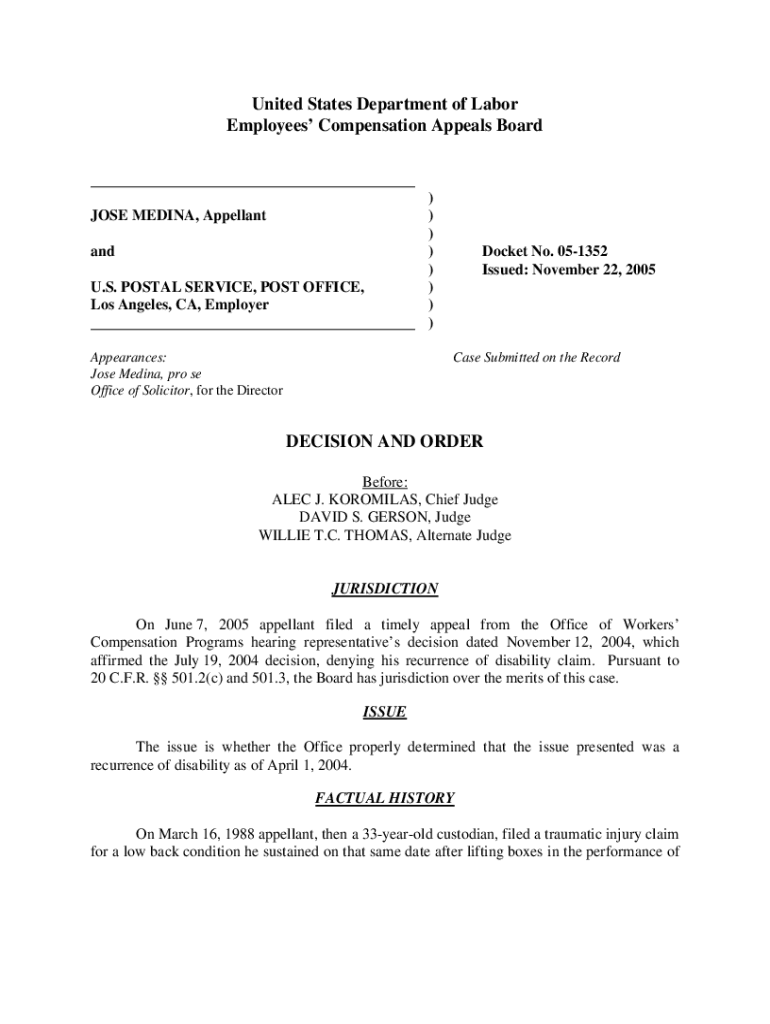 United States Department of Labor Employees Compensation Appeals Board ___))) and)) U.S. POSTAL SERVICE, POST OFFICE,) Los Angeles, CA, Employer) ___) JOSE MEDINA, AppellantAppearances: Jose Medina,
