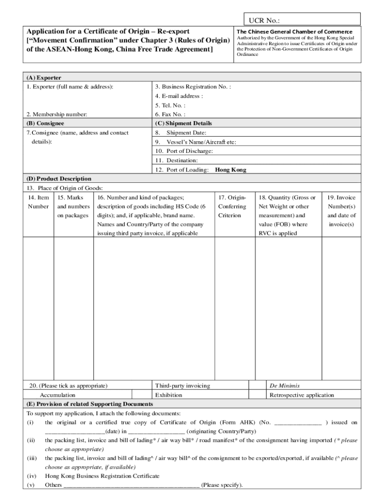 Application for a Certificate of Origin Reexport [Movement Confirmation under Chapter 3 (Rules of Origin) of the Swansong Kong, China Free Trade Agreement]UCR No.: The Chinese General Chamber of Commerce