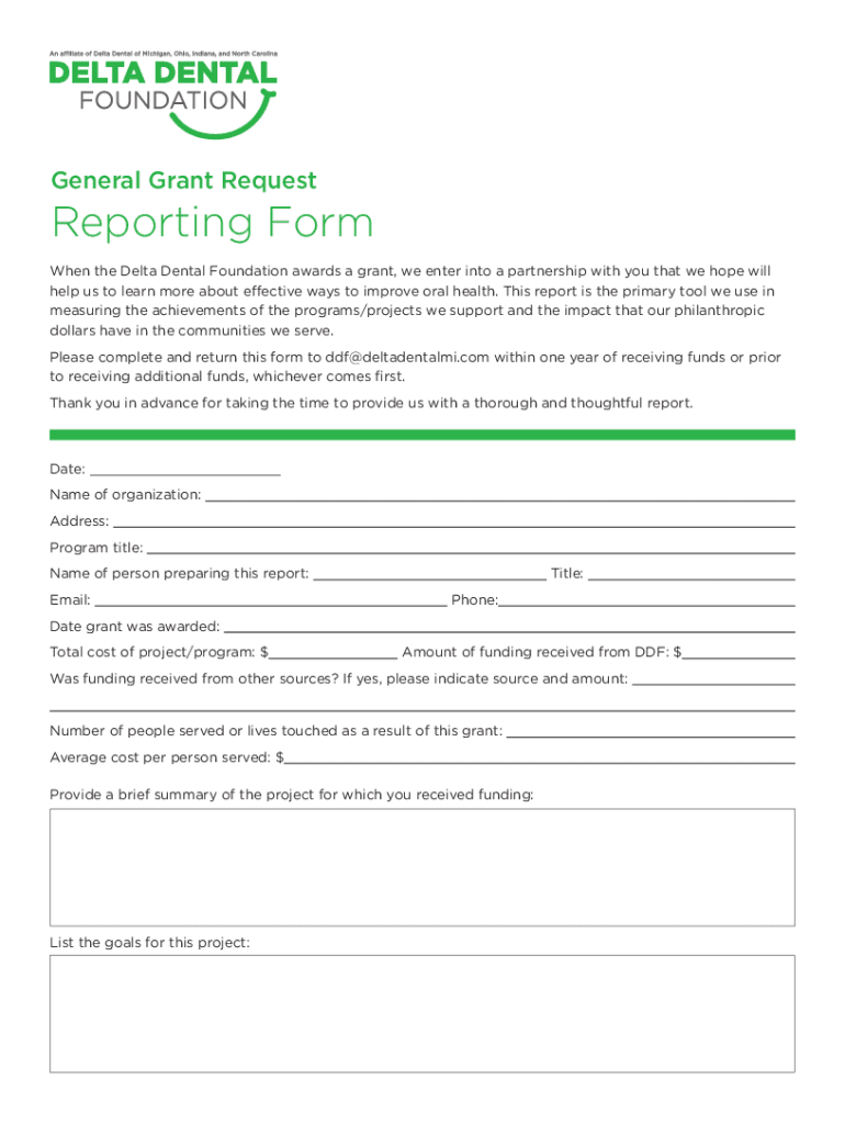 Information such as grant amounts, grant recipients, and activities funded by the grants must be reported on the Delta Dental Foundation General form.