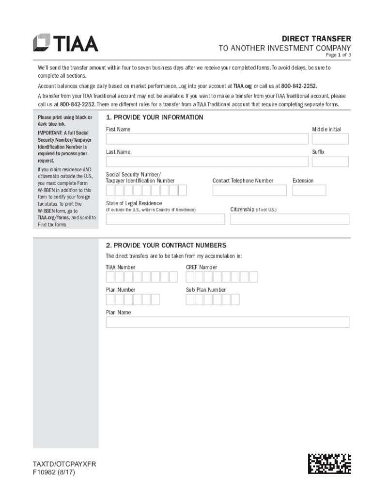 DIRECT TRANSFER TO ANOTHER INVESTMENT COMPANY Page 1 of 3Well send the transfer amount within four to seven business days after we receive your completed forms. To avoid delays, be sure to complete