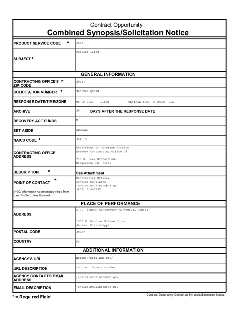 Contract OpportunityCombined Synopsis/Solicitation Notice *PRODUCT SERVICE CODE6515 Patient LiftsSUBJECT *GENERAL INFORMATION CONTRACTING OFFICE\'S OPCODE×SOLICITATION NUMBER×39157 36C25621Q0740RESPONSE