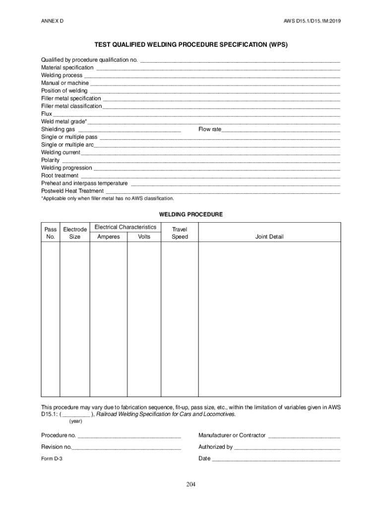 ANNEX DAYS D15.1/D15.1M:2019TEST QUALIFIED WELDING PROCEDURE SPECIFICATION (WPS) Qualified by procedure qualification no. ___ Material specification ___ Welding process ___ Manual or machine ___ Position