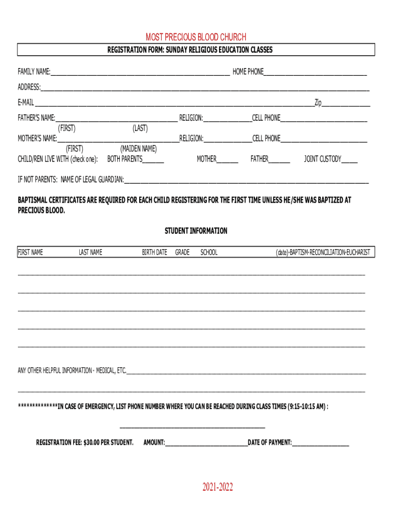 MOST PRECIOUS BLOOD CHURCH REGISTRATION FORM: SUNDAY RELIGIOUS EDUCATION CLASSES FAMILY NAME:___ HOME PHONE___ ADDRESS:___ EMAIL ___Zip___ FATHERS NAME:___ RELIGION:___CELL PHONE___ (FIRST) (LAST)