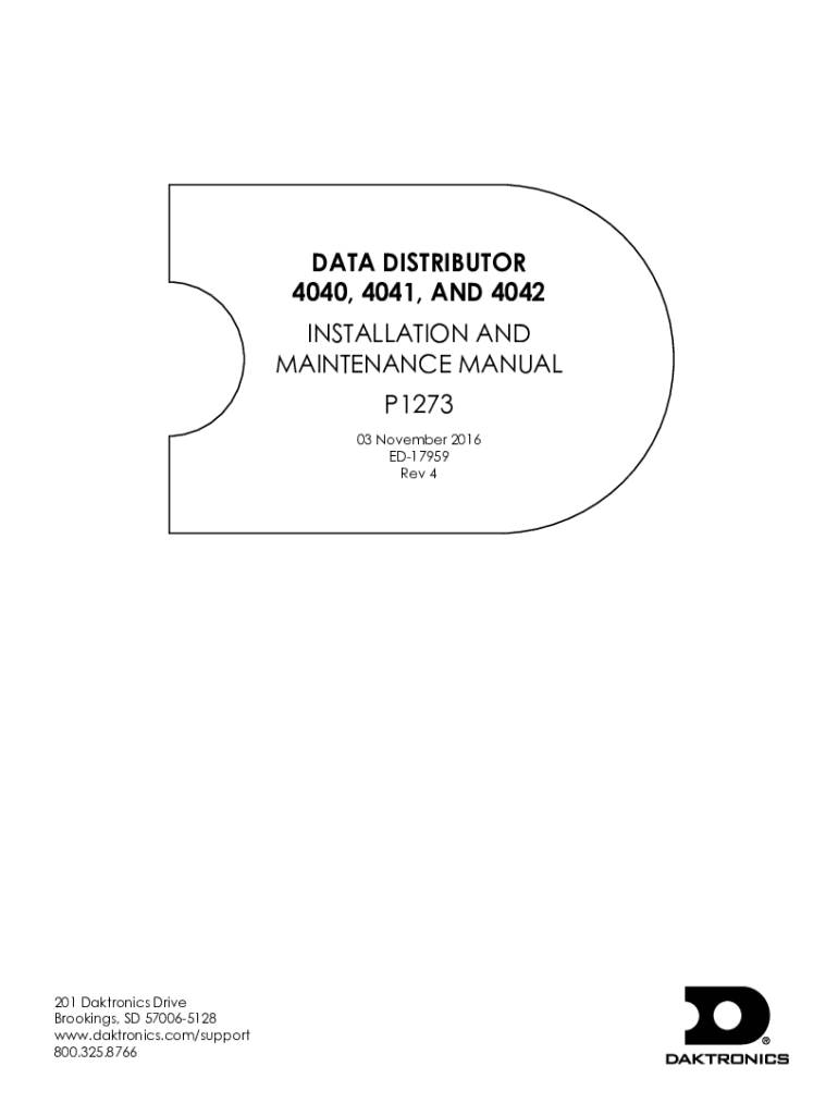 DATA DISTRIBUTOR 4040, 4041, AND 4042 INSTALLATION AND MAINTENANCE MANUAL P1273 03 November 2016 ED17959 Rev 4201 Daktronics Drive Brookings, SD 570065128 www.daktronics.com/support 800.325.8766Copyright