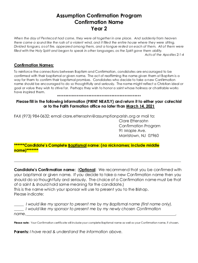 Assumption Confirmation Program Confirmation Name Year 2 When the day of Pentecost had come, they were all together in one place. And suddenly from heaven there came a sound like the rush of a violent