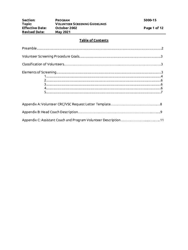 Section: Topic: Effective Date: Revised Date:PROGRAM VOLUNTEER SCREENING GUIDELINES October 2002 May 2021500015-Page 1 of 12Table of Contents Preamble......................................................................................................................................................2