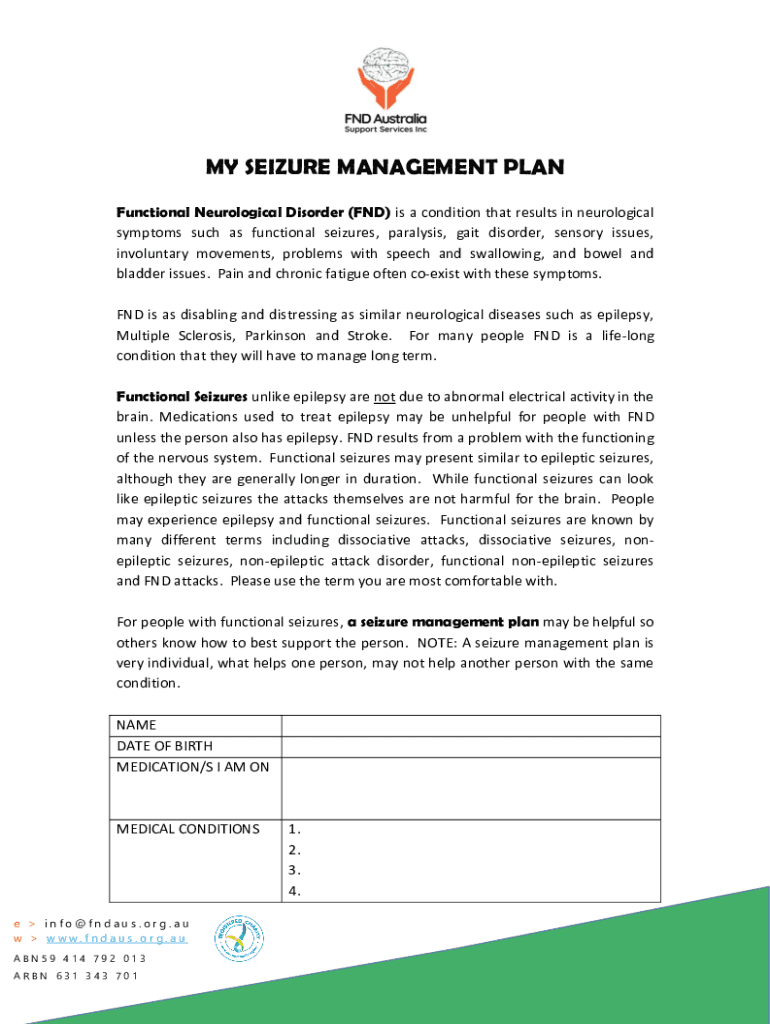 MY SEIZURE MANAGEMENT PLAN Functional Neurological Disorder (AND) is a condition that results in neurological symptoms such as functional seizures, paralysis, gait disorder, sensory issues, involuntary