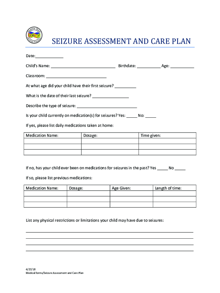 wwwd120orgassets1seizure assessment and care should be filled out with detailed information about the seizure event, triggers, response provided, and any follow-up care needed.