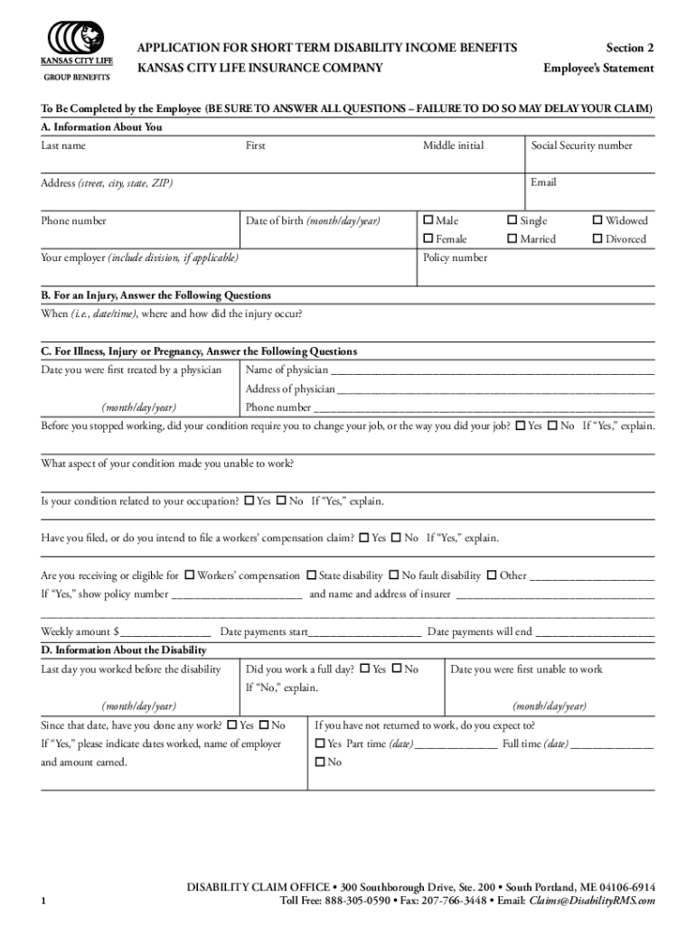 APPLICATION FOR SHORT TERM DISABILITY INCOME BENEFITSSection 2KANSAS CITY LIFE INSURANCE COMPANYEmployees Statement Be Completed by the Employee (BE SURE TO ANSWER ALL QUESTIONS FAILURE TO DO SO MAY