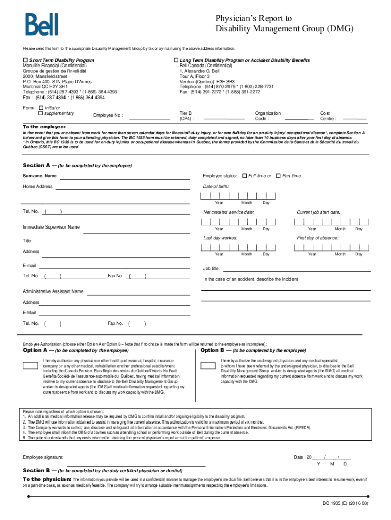 Physicians Report to Disability Management Group (DMG) Please send this form to the appropriate Disability Management Group by fax or by mail using the above address information. Short Term Disability