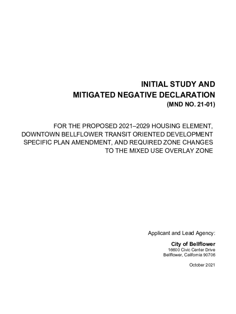INITIAL STUDY AND MITIGATED NEGATIVE DECLARATION (AND NO. 2101)FOR THE PROPOSED 20212029 HOUSING ELEMENT, DOWNTOWN BELLFLOWER TRANSIT ORIENTED DEVELOPMENT SPECIFIC PLAN AMENDMENT, AND REQUIRED ZONE