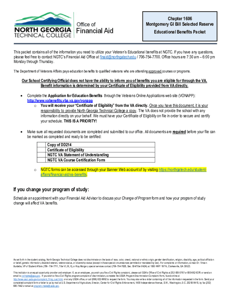Chapter 1606 Montgomery GI Bill Selected Reserve Educational Benefits Packets packet contains all the information you need to utilize your Veterans Educational benefits at NGC. If you have any questions,