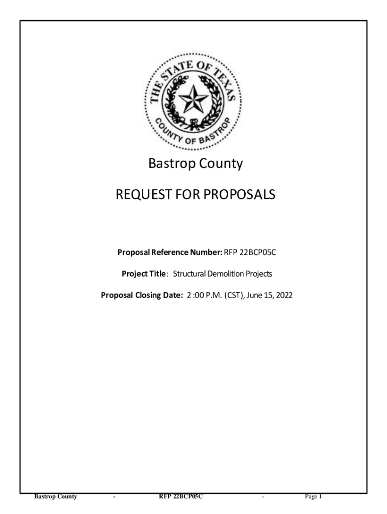 Bastrop County REQUEST FOR PROPOSALSProposal Reference Number: RFP 22BCP05C Project Title: Structural Demolition Projects Proposal Closing Date: 2 :00 P.M. (CST), June 15, 2022Bastrop County RFP 22BCP05CPage