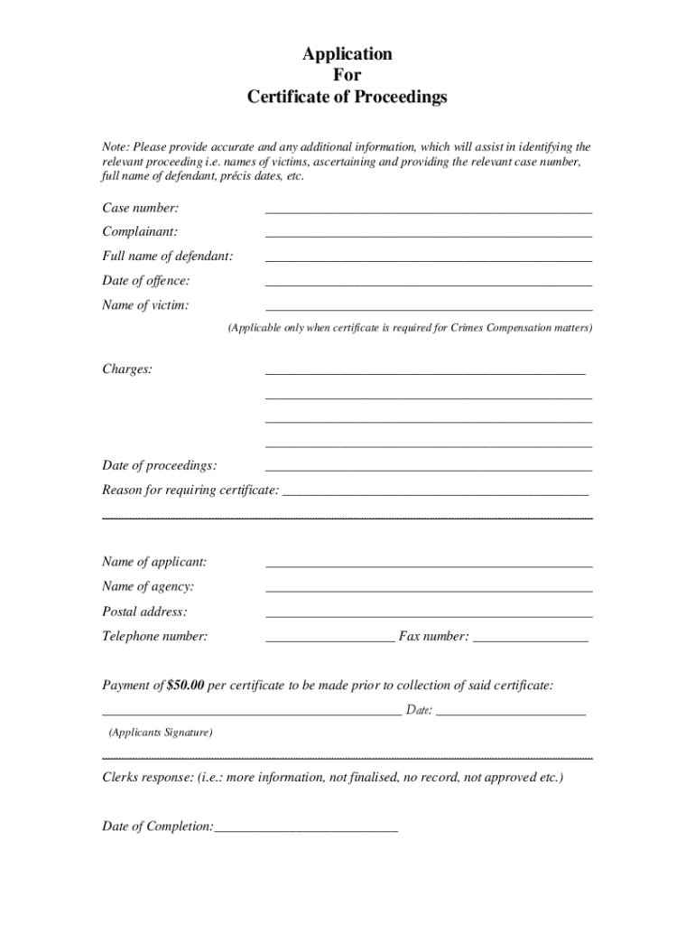 Application For Certificate of Proceedings Note: Please provide accurate and any additional information, which will assist in identifying the relevant proceeding i.e. names of victims, ascertaining