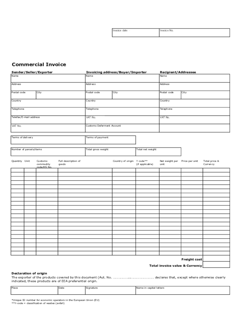 Shipping date Invoice defender\'s reference/Invoice No. Invoice No. Commercial Invoice Handelsfaktura Sender/Seller/ExporterInvoicing address/Buyer/ImporterRecipient/AddresseeNameNameNameAddressAddressAddressPostal
