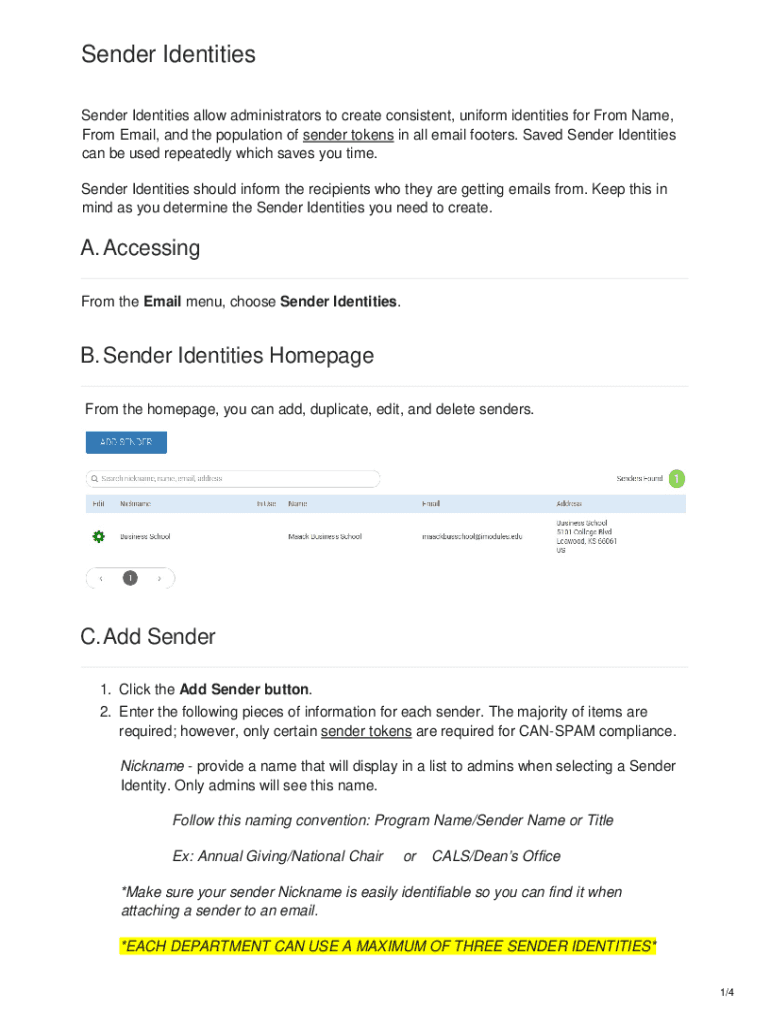 Sender Identities allow administrators to create consistent, uniform identities for From Name, From Email, and the population of sender tokens in all email footers. Saved Sender Identities can be