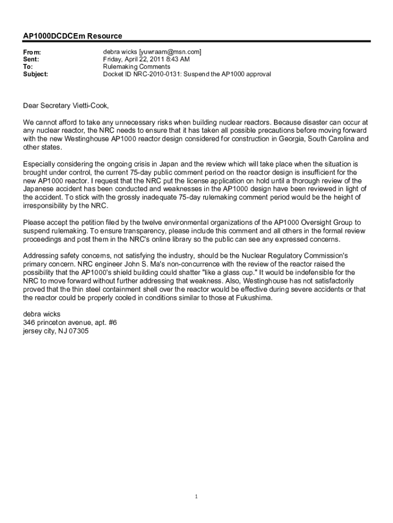 Get the free www.nrc.govdocsML11202011/04/22 - Comment (7363) Form E-mail regarding the AP1000 ...