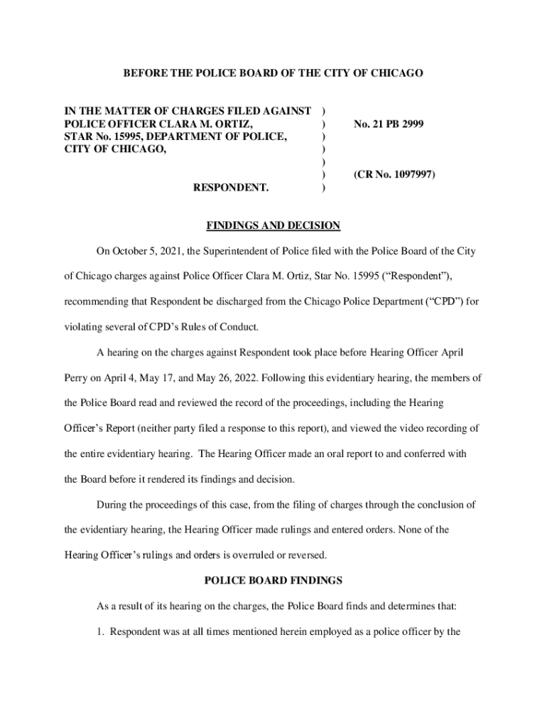 BEFORE THE POLICE BOARD OF THE CITY OF CHICAGOAN THE MATTER OF CHARGES FILED AGAINST POLICE OFFICER CLARA M. ORTIZ, STAR No. 15995, DEPARTMENT OF POLICE, CITY OF CHICAGO, RESPONDENT.) ))))))No. 21