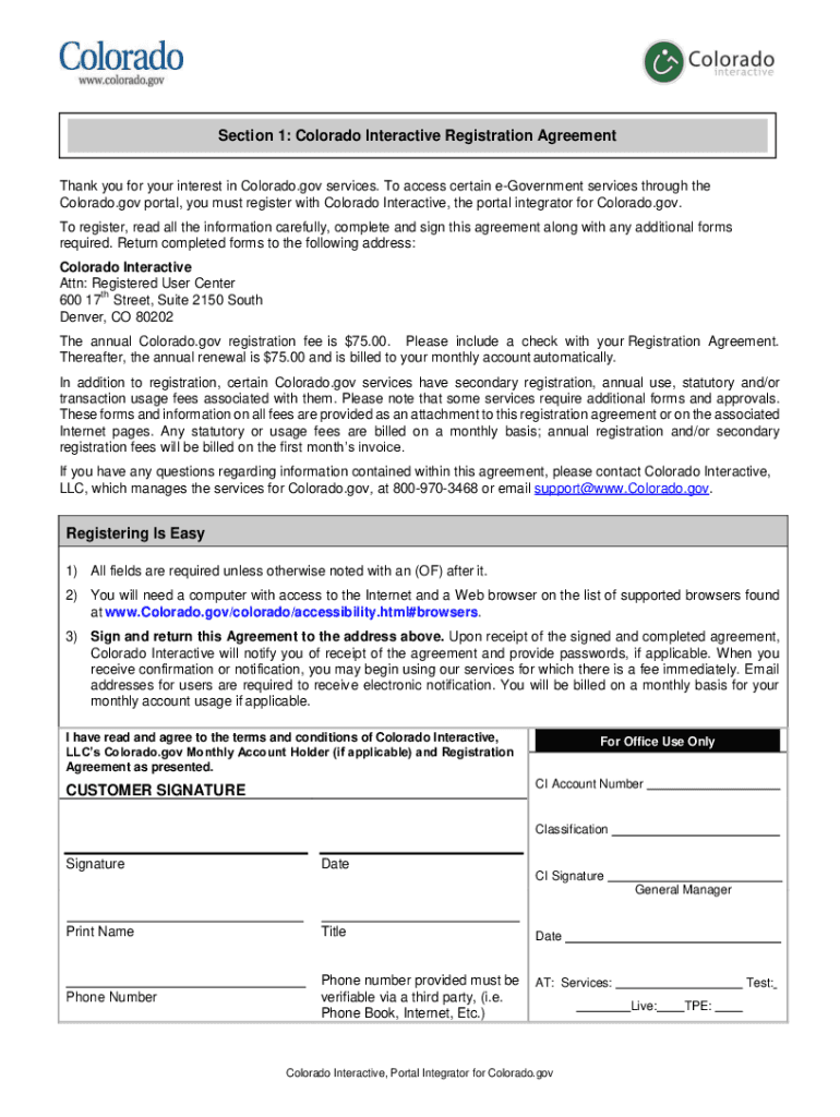 Section 1: Colorado Interactive Registration Agreement Thank you for your interest in Colorado.gov services. To access certain government services through the Colorado.gov portal, you must register