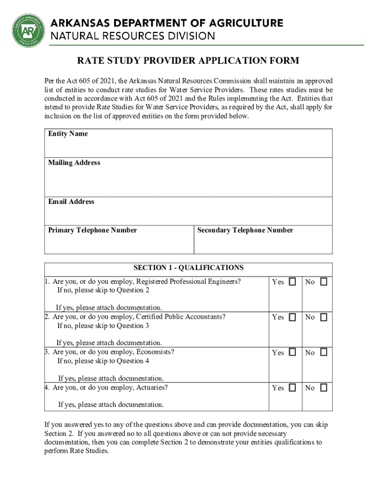 RATE STUDY PROVIDER APPLICATION FORM Per the Act 605 of 2021, the Arkansas Natural Resources Commission shall maintain an approved list of entities to conduct rate studies for Water Service Providers.