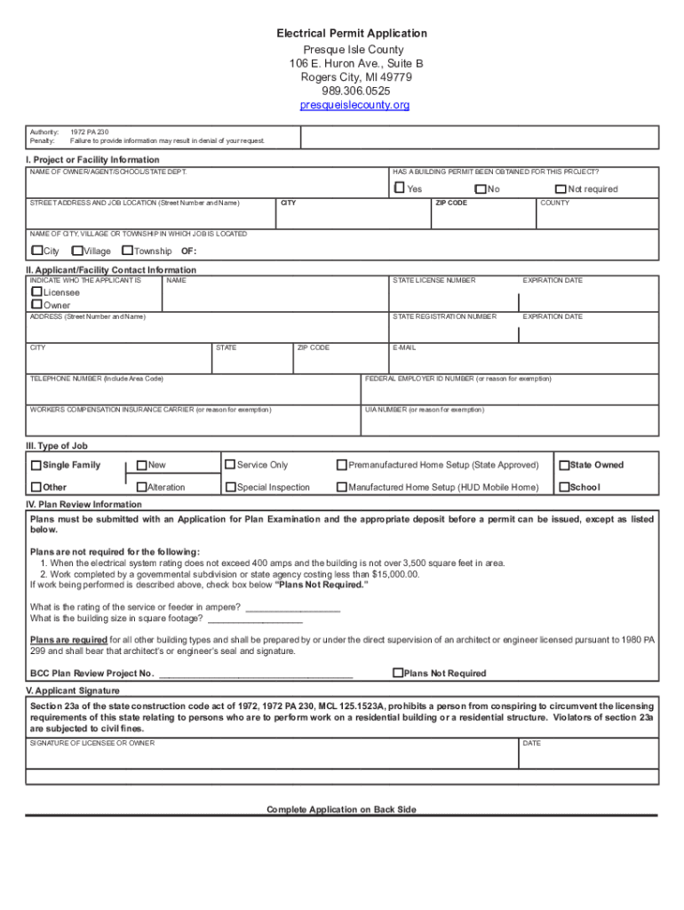 Electrical Permit Application Pressure Isle County106 E. Huron Ave., Suite B Rogers City, MI 49779 989.306.0525 presqueislecounty.authority: Penalty:1972 PA 230 Failure to provide information may