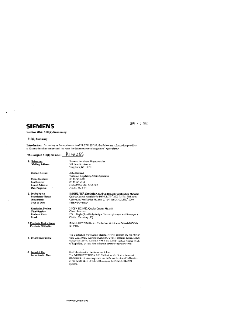 SIEMENS MAR 520114Section 006: 510(k) Summary 510(k) Summary Introduction: According to the requirements of 2l CFR 807.92, the following information provides sufficient details to understand the basis