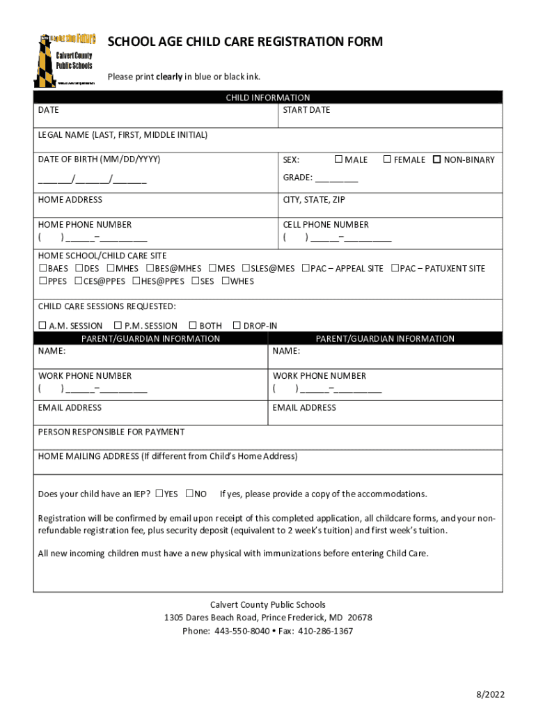 SCHOOL AGE CHILD CARE REGISTRATION FORM Please print clearly in blue or black ink. CHILD INFORMATION START DATED ATE LEGAL NAME (LAST, FIRST, MIDDLE INITIAL) DATE OF BIRTH (MM/DD/YYY)SEX:___/___/___GRADE: