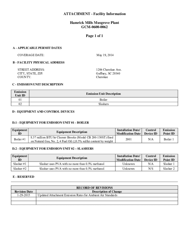 ATTACHMENT Facility Information Hayrick Mills Musgrove Plant GCM06000062 Page 1 of 1 A APPLICABLE PERMIT DATES COVERAGE DATE:May 19, 2014B FACILITY PHYSICAL ADDRESS STREET ADDRESS: CITY, STATE, ZIP: