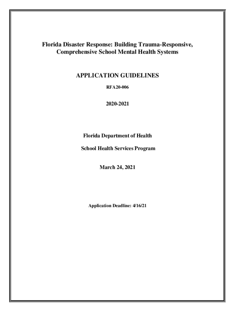 Florida Disaster Response: Building TraumaResponsive, Comprehensive School Mental Health SystemsAPPLICATION GUIDELINES RFA2000620202021Florida Department of Health School Health Services Program March