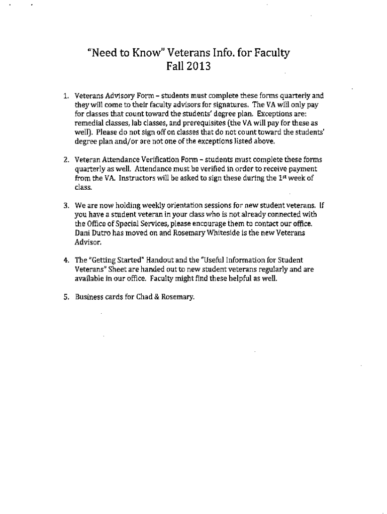 \” Need to Know\” Veterans Info. For Faculty Fall 2013 1. Veterans Advisory Form students must complete these forms quarterly, and they will come to their faculty advisors for signatures. The
