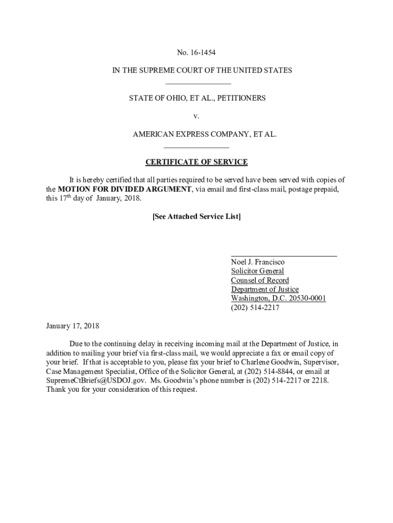 No. 161454 IN THE SUPREME COURT OF THE UNITED STATES ___ STATE OF OHIO, ET AL., PETITIONERS v. AMERICAN EXPRESS COMPANY, ET AL. ___ CERTIFICATE OF SERVICE It is hereby certified that all parties required