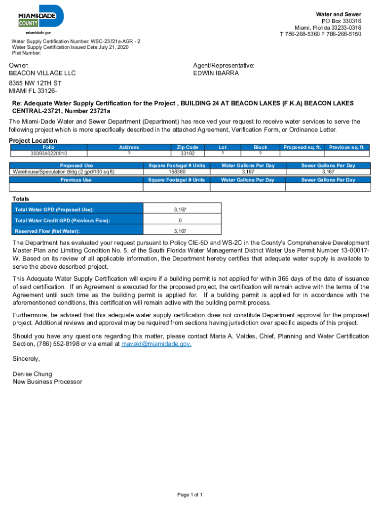 Water and Sewer PO Box 330316 Miami, Florida 332330316 T 7862685360 F 7862685150 Water Supply Certification Number: WSC23721aAGR 2 Water Supply Certification Issued Date:July 21, 2020, Plat Number:Owner: