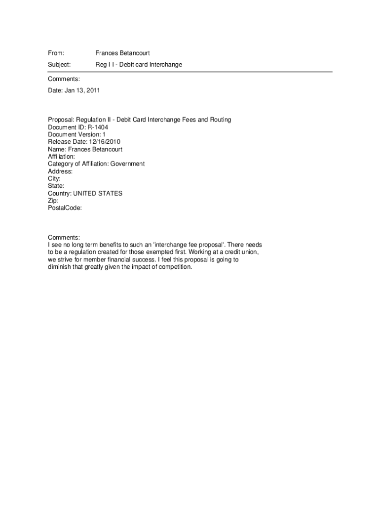 Get the free From: Frances Betancourt Subject: Reg I I - Debit card Interchange ...