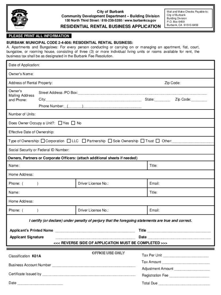 City of Burbank Community Development Department Building Division 150 North Third Street / 8182385280 / www.burbankca.govRESIDENTIAL RENTAL BUSINESS APPLICATIONMail and Make Checks Payable to: City