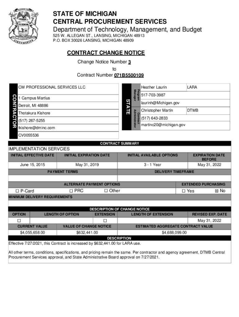 P.O. BOX 30026 LANSING, MICHIGAN 48909CONTRACT CHANGE NOTICE